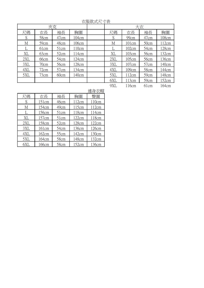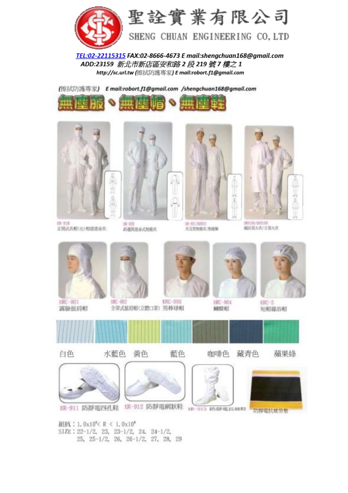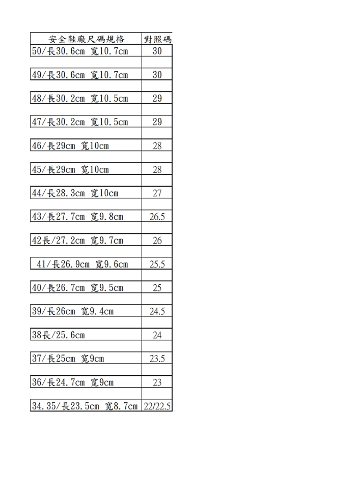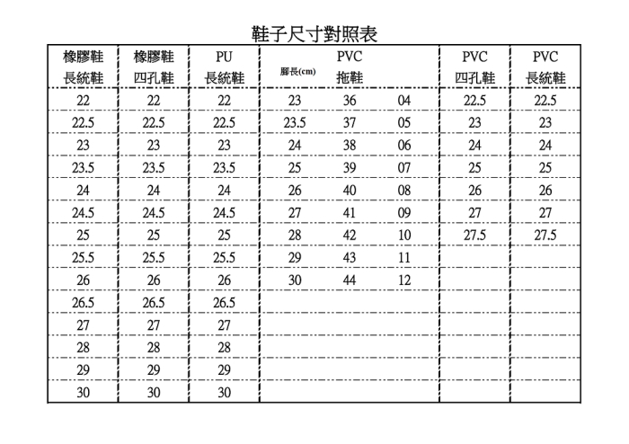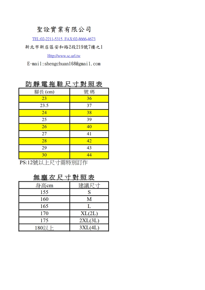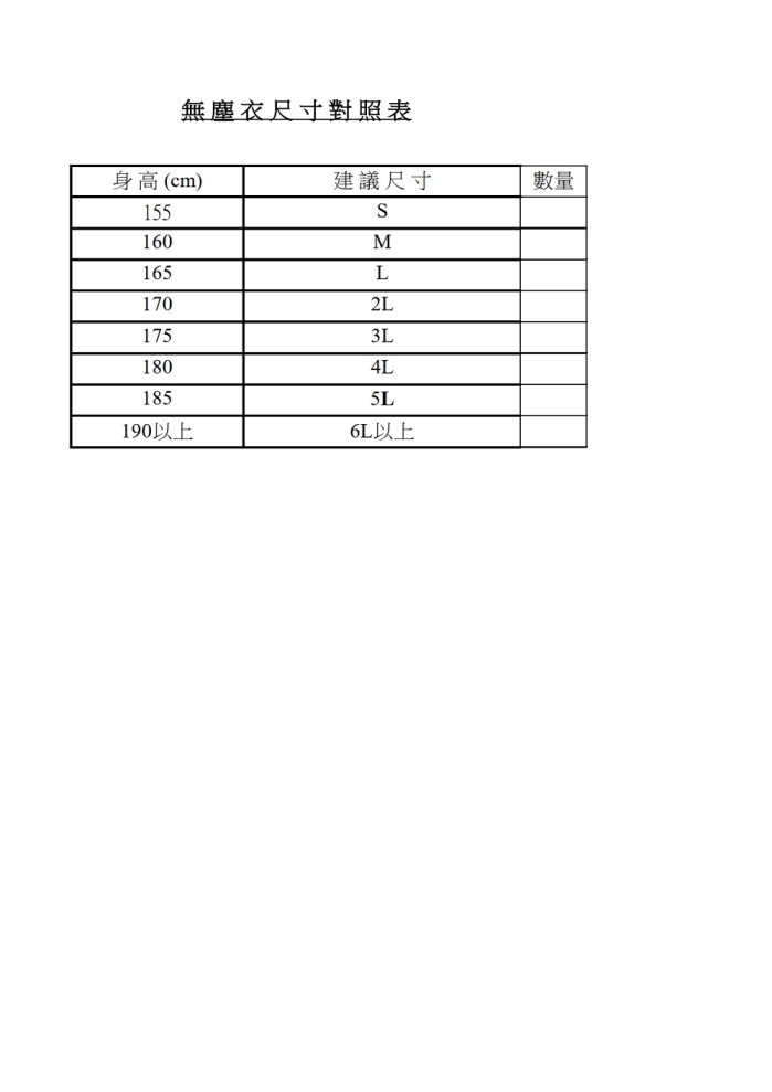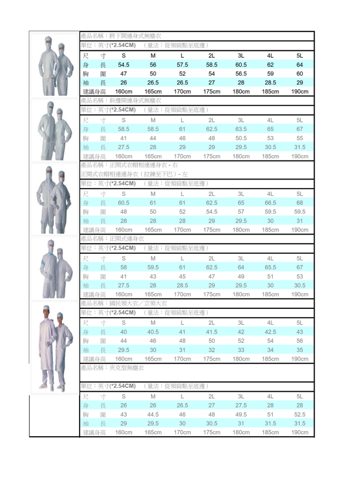 無塵衣、鞋尺寸對照表